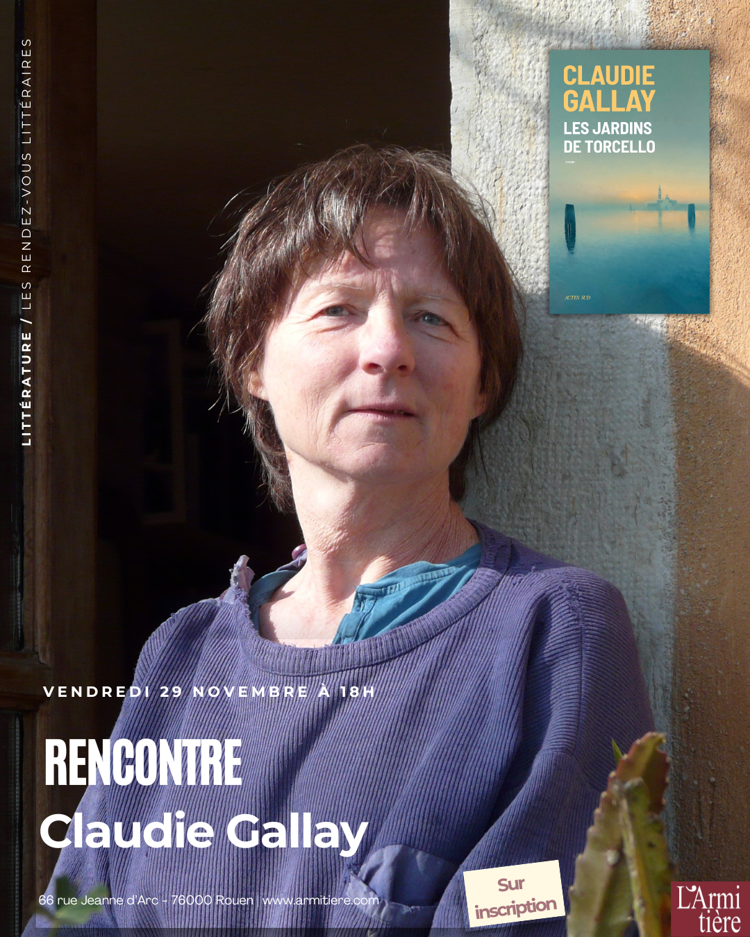 Née en 1961, Claudie Gallay vit en Isère. Elle a publié une douzaine de romans aux éditions du Rouergue et chez Actes Sud, parmi lesquels Seule Venise (2004, prix Folies d’encre et prix du Salon d’Ambronay), Les Déferlantes (2008, Grand Prix des lectrices de Elle), Une part de ciel (2013, prix Terre de France), La Beauté des jours (2017) et Avant l’été (2021). Les Jardins de Torcello paraît en 2024.