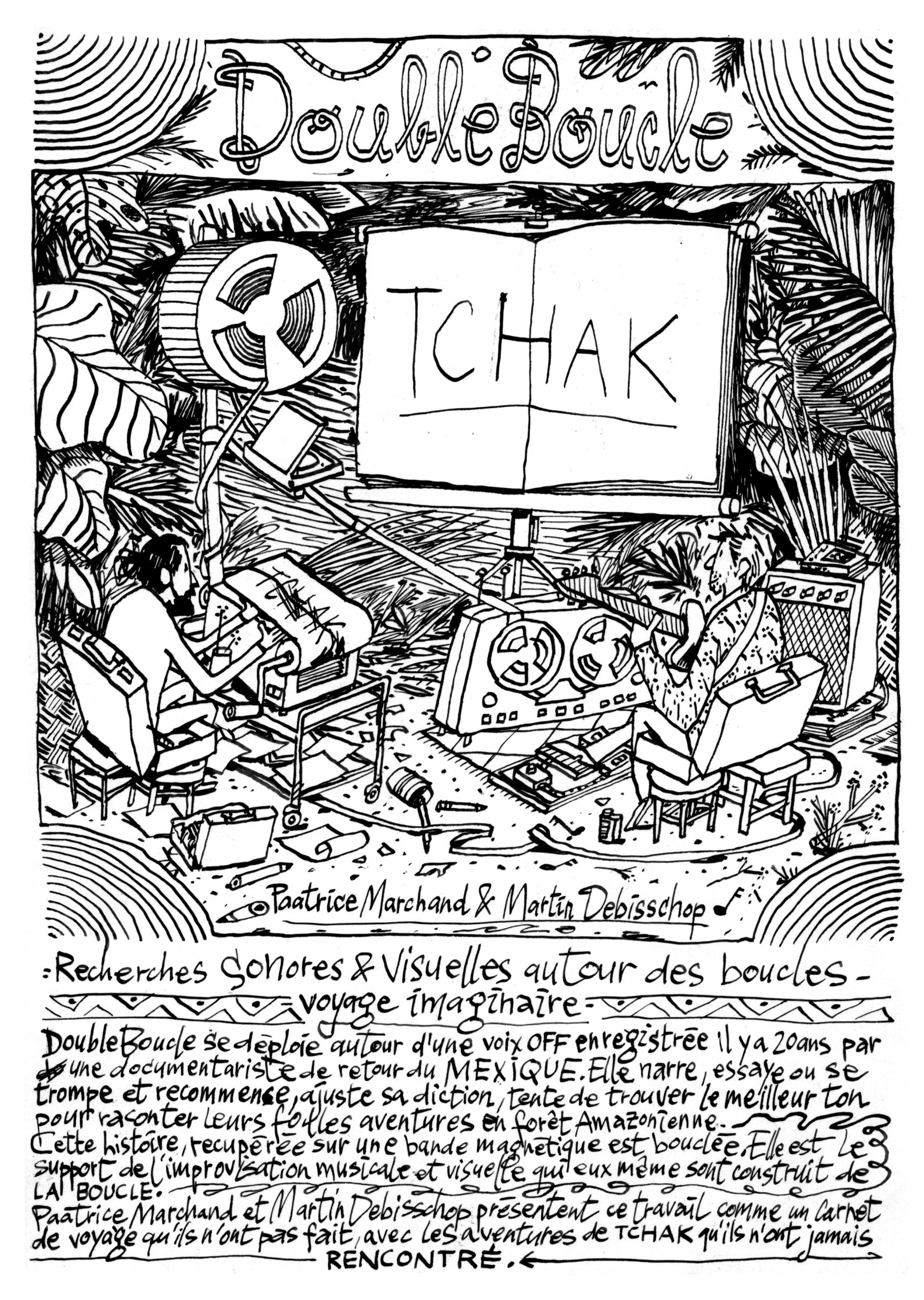 Double Boucle se déploie autour d’une voix off enregistrée il y a 20 ans par une documentariste de retour du Mexique. Elle narre, essaye ou se trompe et recommence, ajuste sa diction, tente de trouver le meilleur ton pour raconter leurs folles aventures en forêt Amazonienne. Cette histoire, récupérée sur une bande magnétique est bouclée. Elle est le support de l’improvisation musicale et visuelle qui eux-même sont construits de la Boucle.