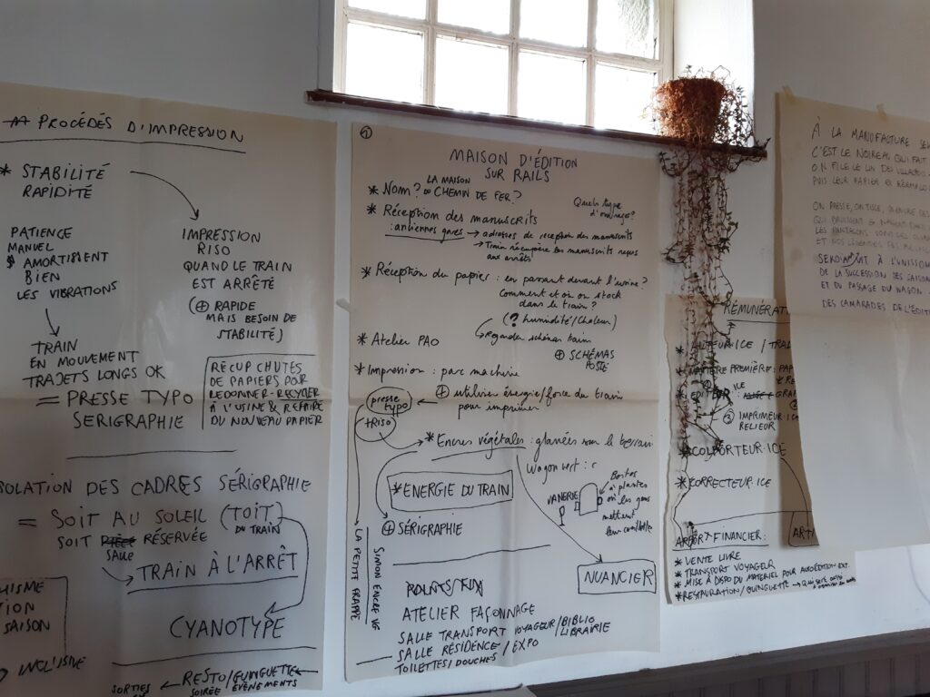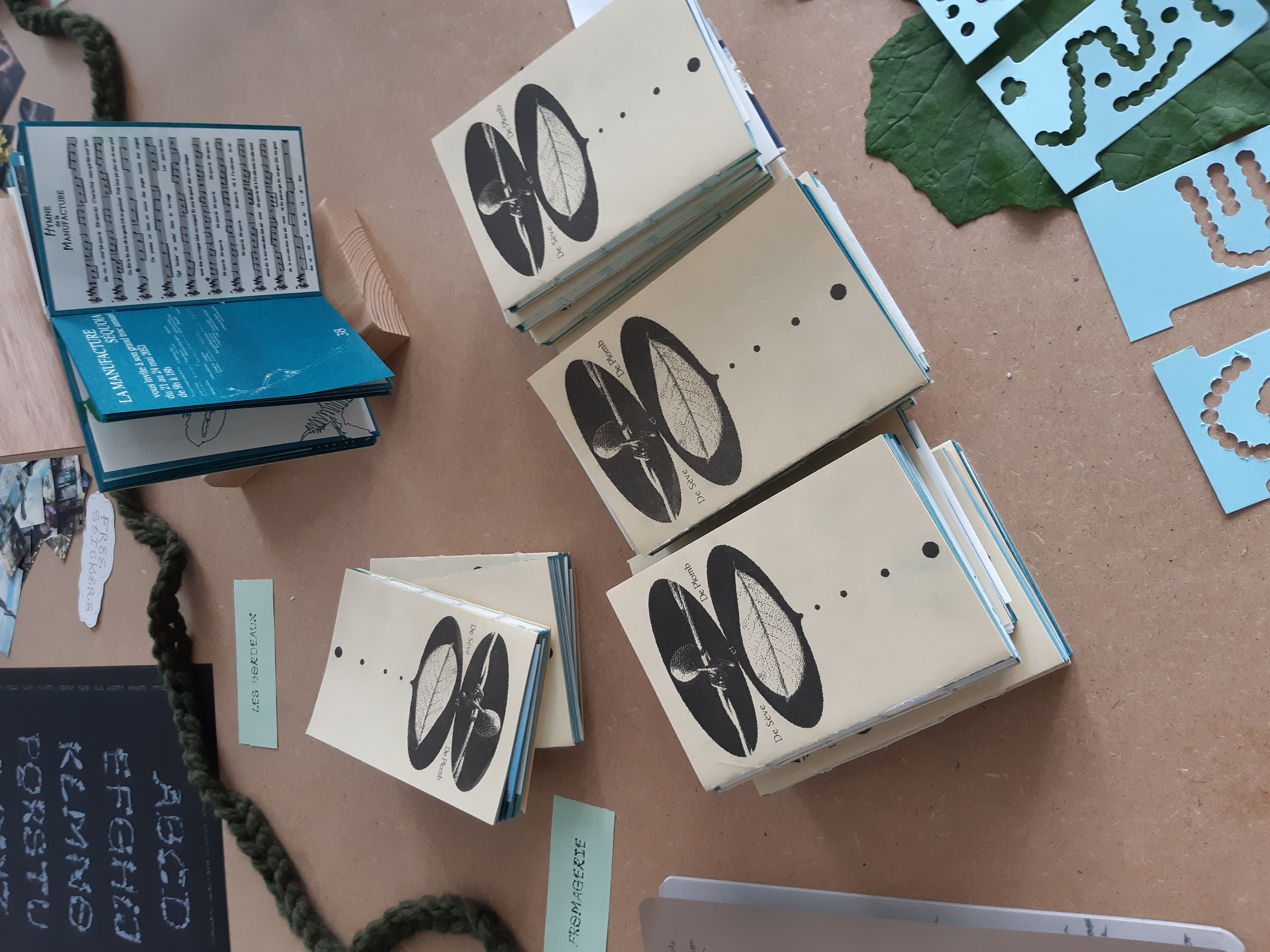 Enrichi de rencontres avec des professionnel(le)s du livre et des acteurs et actrices du territoire, sensibilisation aux enjeux de l’écologie du livre cette enquête collective de terrain a permi la réalisation d’un document grand public, à mi-chemin entre récit historique et fiction (brochure, podcast, exposition, etc.). Il donne à imaginer une maison d’édition sur rail, le retour d’usines de papier à base de lin et à taille humaine, le renouveau des colporteurs et au milieu de ces textes, des dessins, des images, des poèmes, des affiches, des chants et un enregistrement audio pour accompagner la lecture.