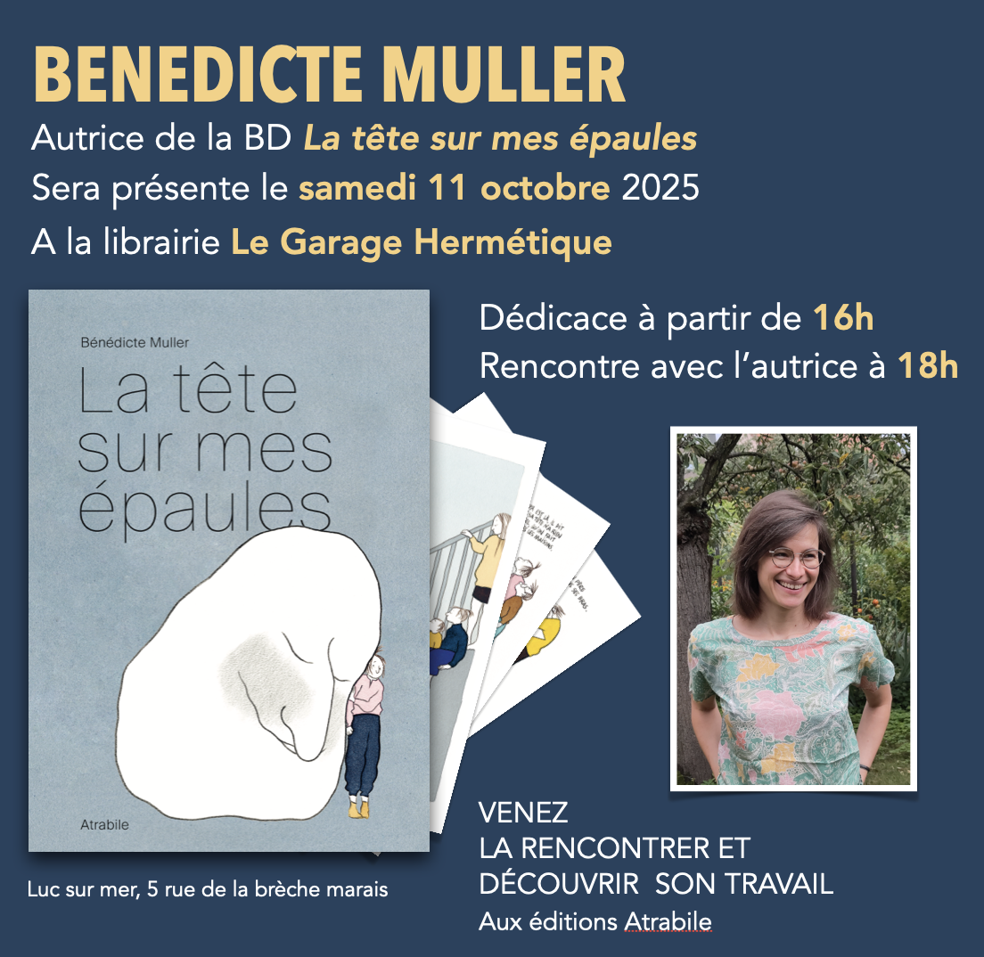 Benedicte Muller sera présente le samedi 11 octobre 2025 à la librairie pour dédicacer sa bande dessinée "la tête sur mes épaules" publiée aux éditions Atrabile. Énorme coup de cœur pour son dessin et sa narration autour de l'enfance, de