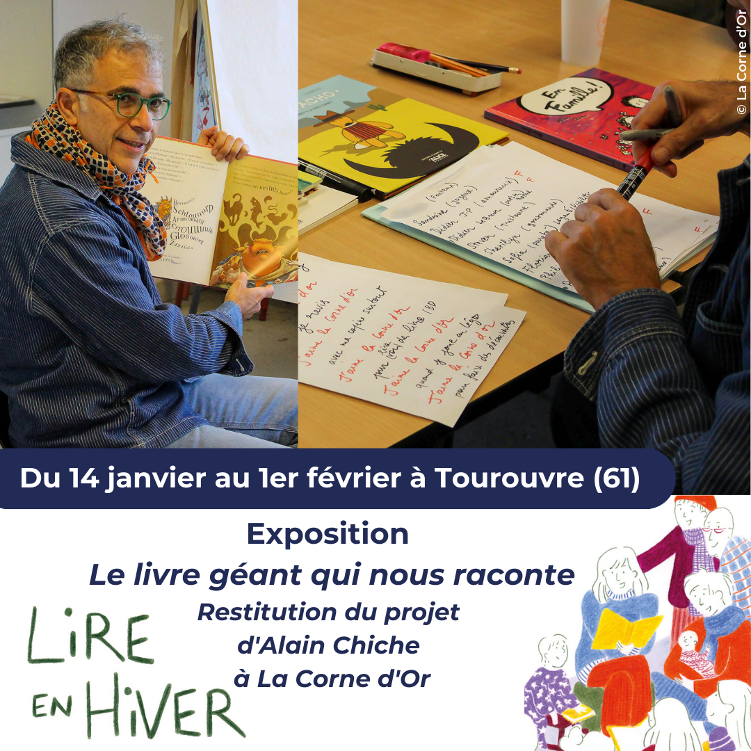 Du 14 janvier au 1er février à la médiathèque de Tourouvre (61) : Exposition Le livre géant qui nous raconte, restitution du projet d’Alain Chiche à La Corne d’Or.