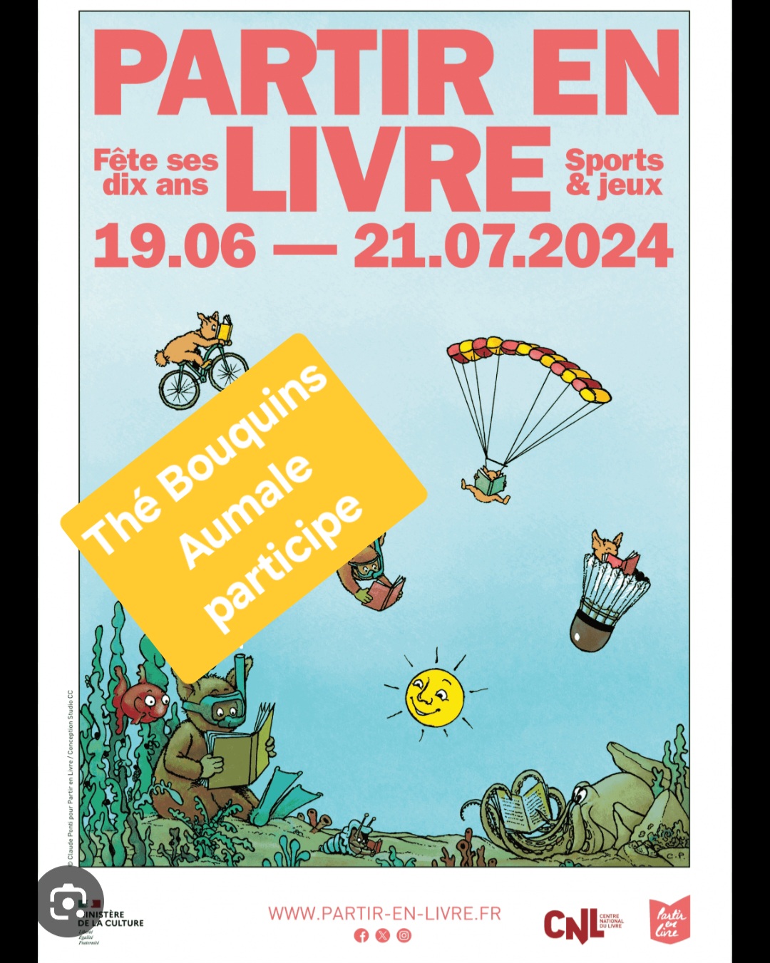 Thé bouquins participe à partir en livre et propose du 19 juin au 21 juillet de nombreuses activités : Atelier jeunesse 5 a 7 ans Atelier jeunesse 8 à 10 ans Tombola Remise -50% sur les livres Concert Après midi