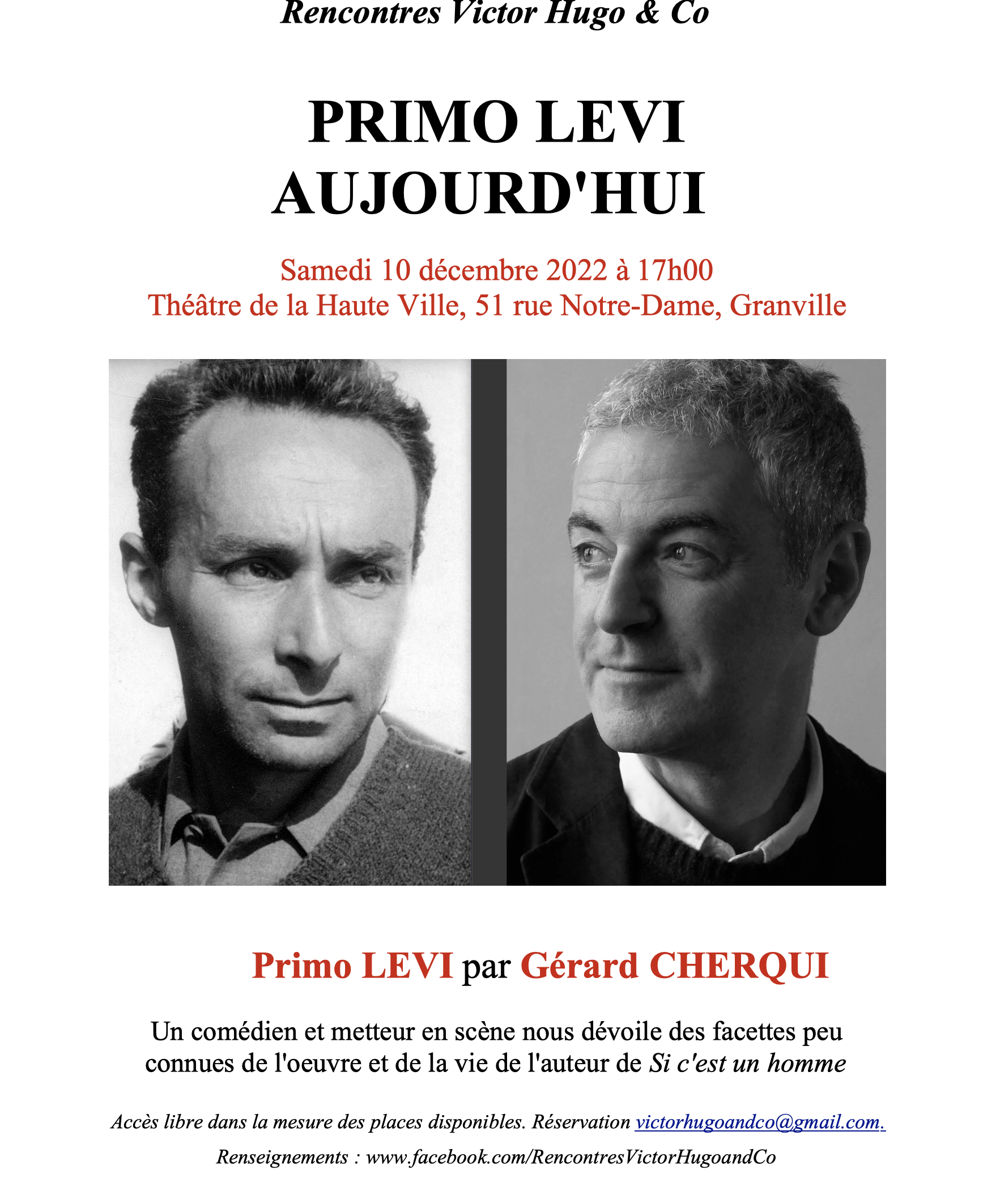 Le samedi 10 décembre, à 17:00, les Rencontres Victor Hugo & Co organisent une rencontre dédiée à Primo Levi. L’auteur de «Si c’est un homme» n’a pas écrit que sur l’univers concentrationnaire. Par le biais d’une lecture, Gérard Cherqui, comédien, auteur et metteur en scène, nous révélera d’autres facettes de la vie et de l’œuvre de Primo Levi. Gérard Cherqui a interprété Primo Levi dans le spectacle Levi-Camon : conversations, au Théâtre du Gymnase à Paris.