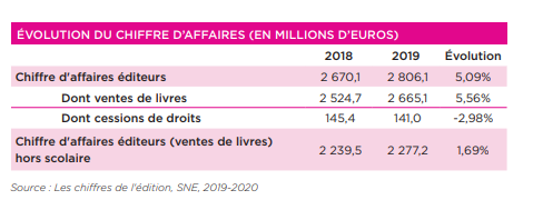 Le chiffre d’affaires des éditeurs (ventes de livres et produit des cessions de droits) est passé de 2 670 millions d’euros en 2018 à 2 806 millions d’euros en 2019, soit une hausse de 5 %. Le nombre d’exemplaires vendus est, quant à lui passé de 419 millions en 2018 à 435 millions en 2019, soit une hausse de 3,8 %